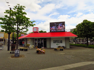 CoffeeLab, just outside the central train station, does not look very appealing from the outside. A strange little white house, with a weird red roof, topped by a huge television screen. But the inside is very warm and welcoming. It is filled with all the expected coffee bar accessories; light wood, plants hanging from the ceiling, coffee plants...the walls are plastered with coffee filters, the water is served in wine glasses. For some it might be a little too much, such as the sign saying 'we miss you already', but we all know that there are lots of people out there who love it.